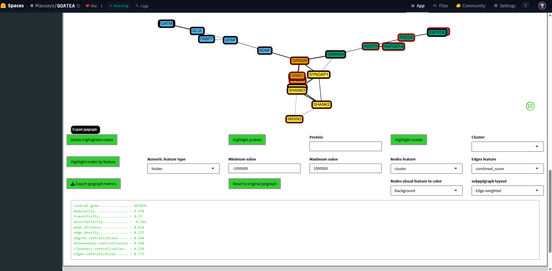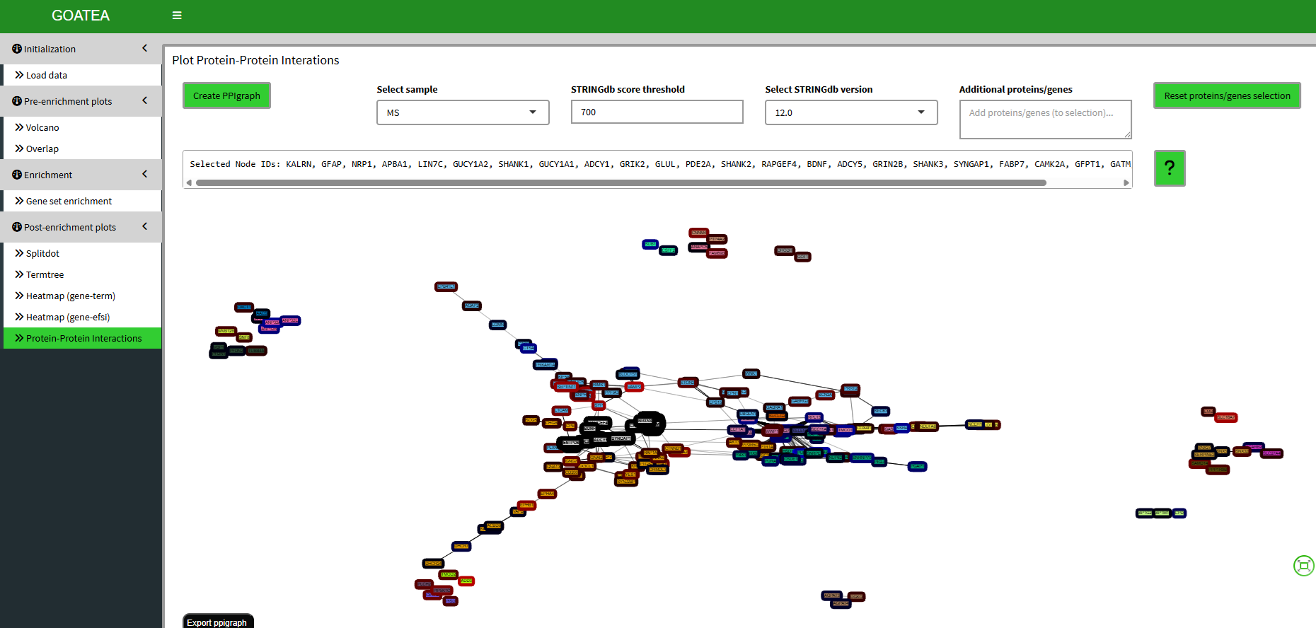 Finally, we ‘GO TO PPI’ for the bottom-up protein-protein interaction graph of the selected genes/proteins, setting the ‘STRINGdb score threshold’ to 700 for recommended stringent filtering. The interaction strength is shown by the opacity of the graph edge.
