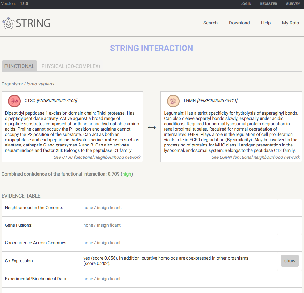 FYI, graph edges can be clicked to inspect their STRING database interaction information.