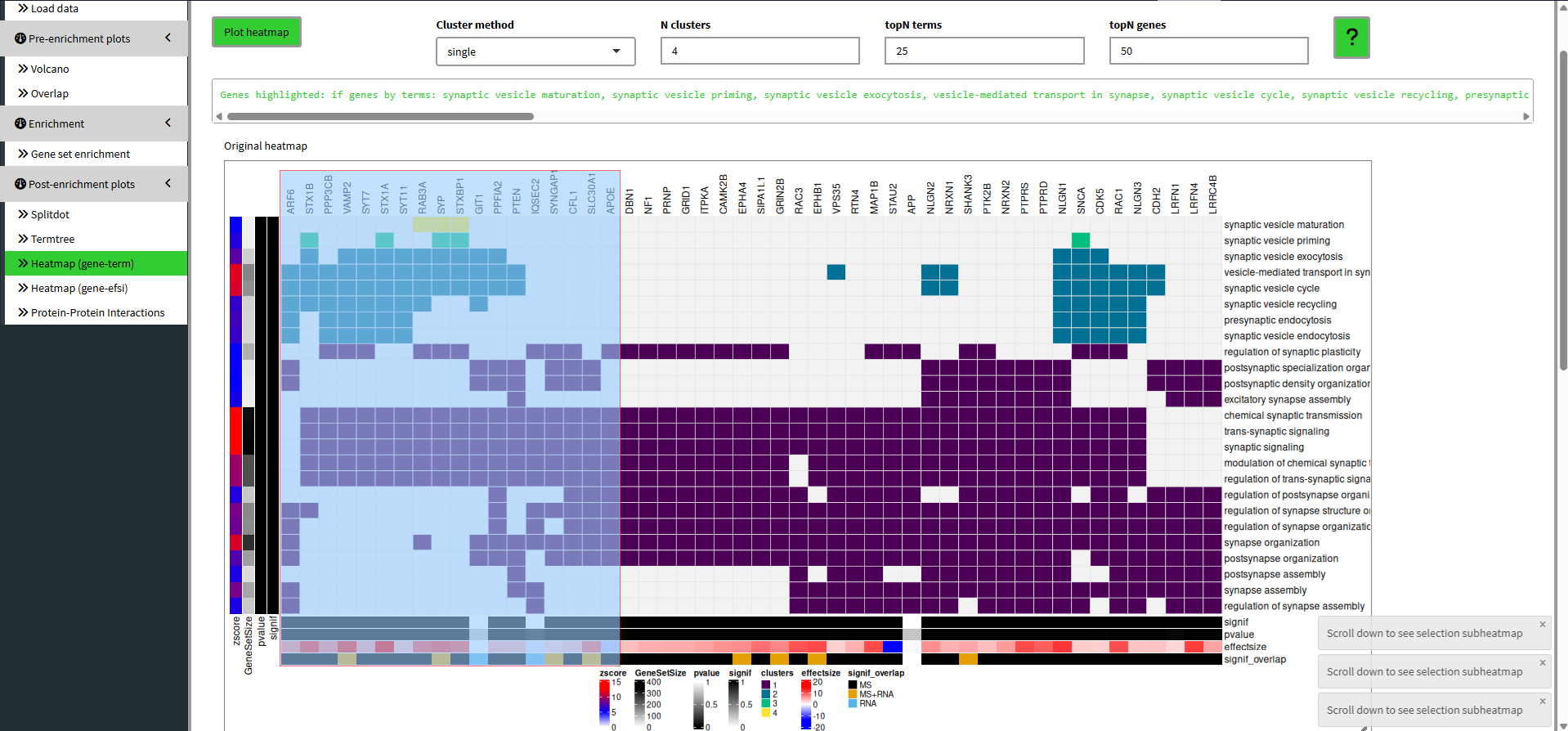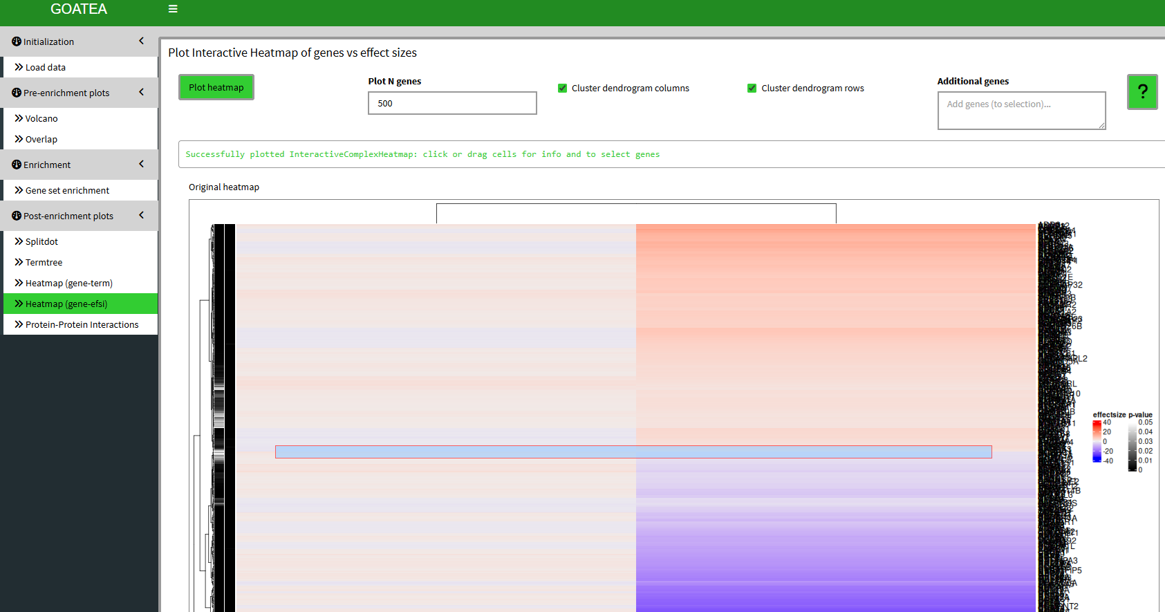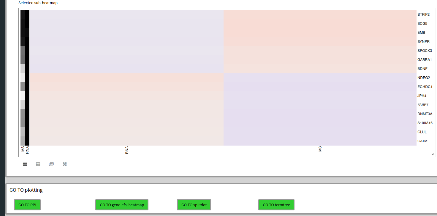 We ‘GO TO gene/effectsize heatmap’, set ‘plot n genes’ to 500 to plot all 484 selected overlapping genes between RNA and MS. Here, the scale difference of effectsize between the samples makes no sense and is therefore purely illustrative. Although, you can see groups of genes by the hierarchical clustering on the left and differences in effectsize coloring to make out potentially interesting groups of genes.
