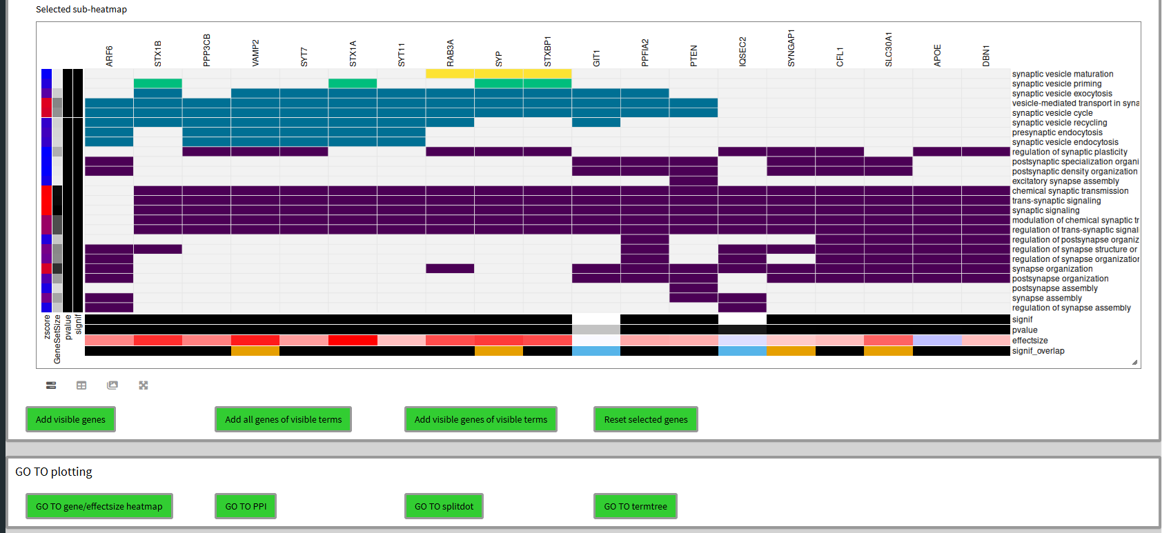 We ‘GO TO gene/genesets heatmap’, set ‘topN terms’ to 25 and ‘topN genes’ to 50 and click ‘plot heatmap’. In the large interactive heatmap that appears there is a lot to see. Genes are on top, with their metadata legend on the bottom whereas genesets are on the right with their metadata legend on the left. If a heatmap cell is colored, it means the gene is in the geneset. The coloring defines clusters and both genes and genesets are hierarchically clustered. This is how you can quickly scan for potentially interesting groups of genes within and between genesets.