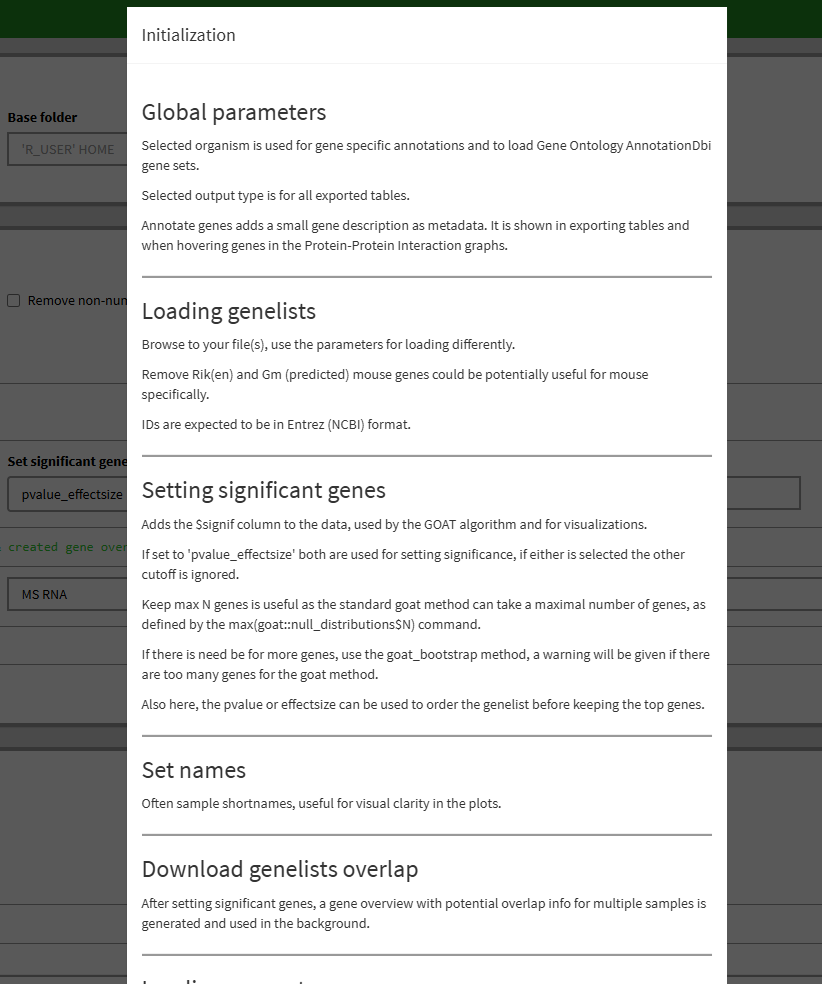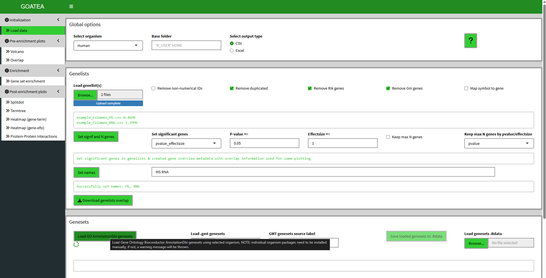 When starting the GOATEA GUI, you land on the ‘initialization - load data’ tab. On top you see the global options, used throughout the rest of the app.