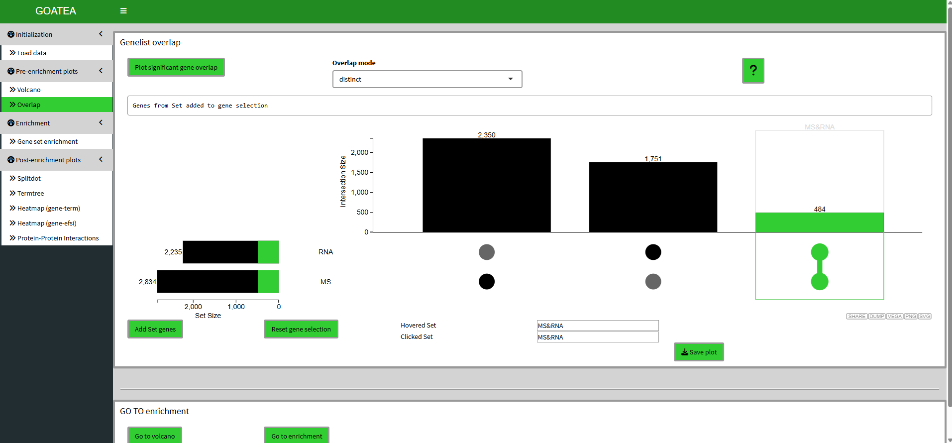 Now we ‘go to overlap’ and click plot with the default distinct mode still on. Here I select the 484 genes that are overlapping by clicking the far right histogram and first click ‘reset gene selection’ before ‘add set genes’. These selected genes/proteins are later used in the gene-effectsize heatmap and protein-protein interaction graph.
