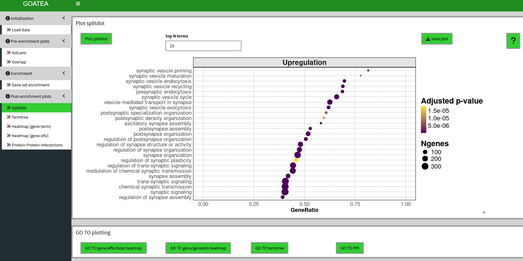 We then ‘GO TO splitdot’, set ‘top N terms’ to 25 and drag the slider at the bottom right to the right to scale the plot size.