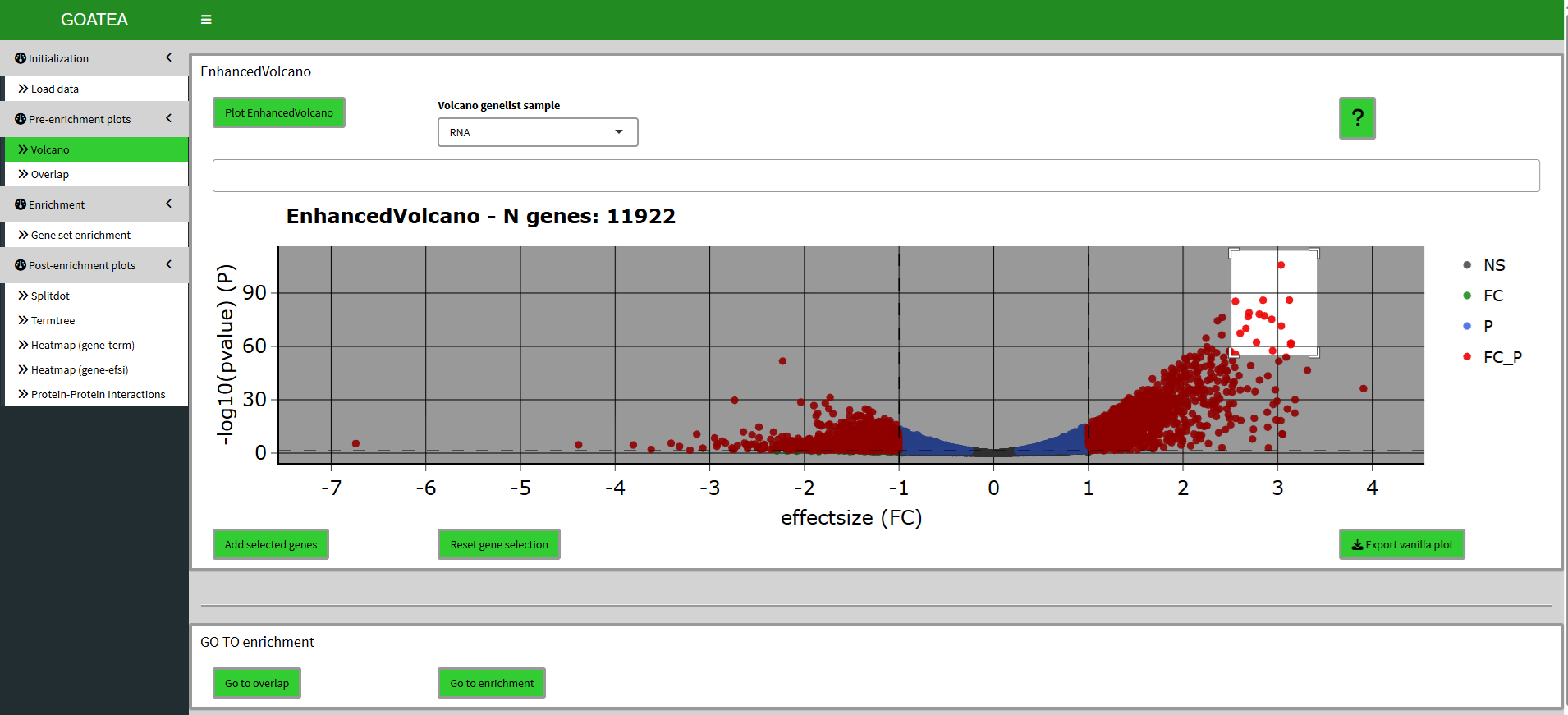 Here, points can be selected by mouse dragging a box around them and clicking the ‘add selected genes’ button.