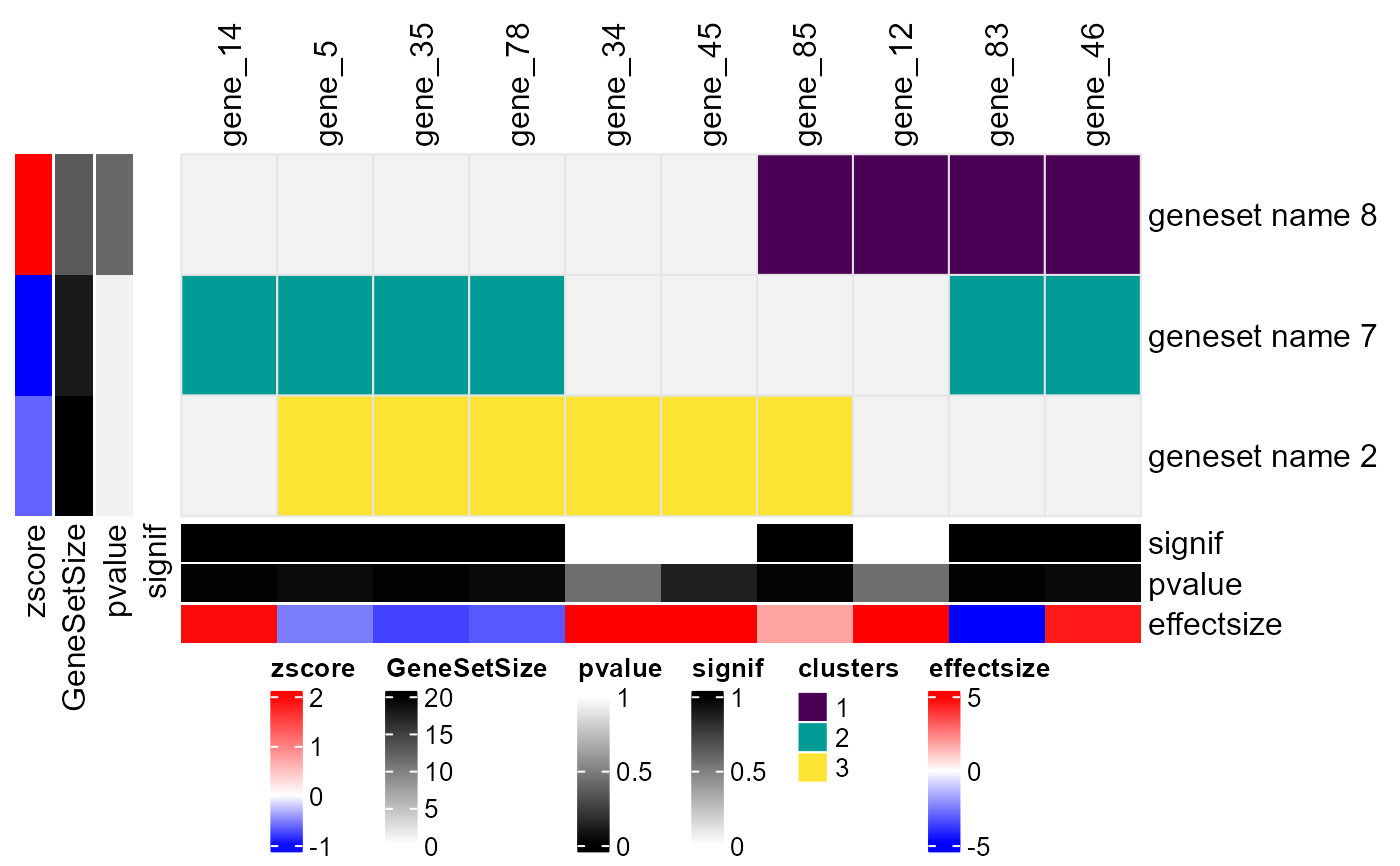 Column annotations: Gene p-values, effect sizes, and optional overlap categories.